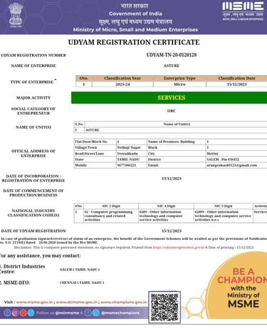 With a strong foundation in innovation, legal identity, and government recognition, Asture delivers trusted, scalable, and industry-grade solutions built with passion, precision, and purpose.